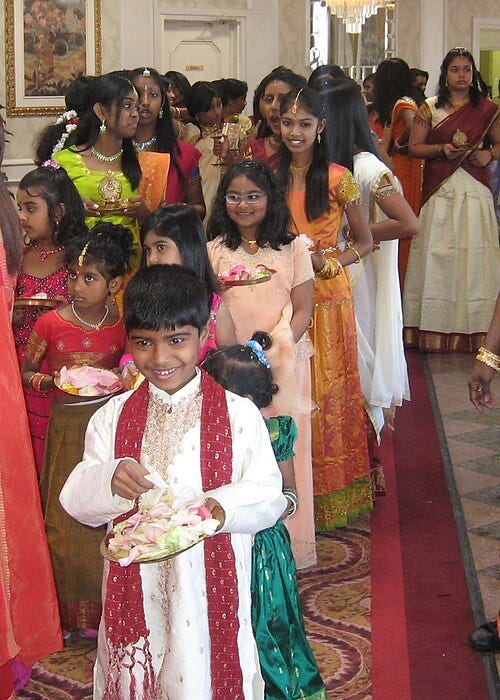 Expatriate Sri Lankan Tamil children in traditional clothes in Toronto, Ontario, Canada (Canadian Sri Lankan Tamil Children - Tamil diaspora - Wikipedia), approximately 2008.