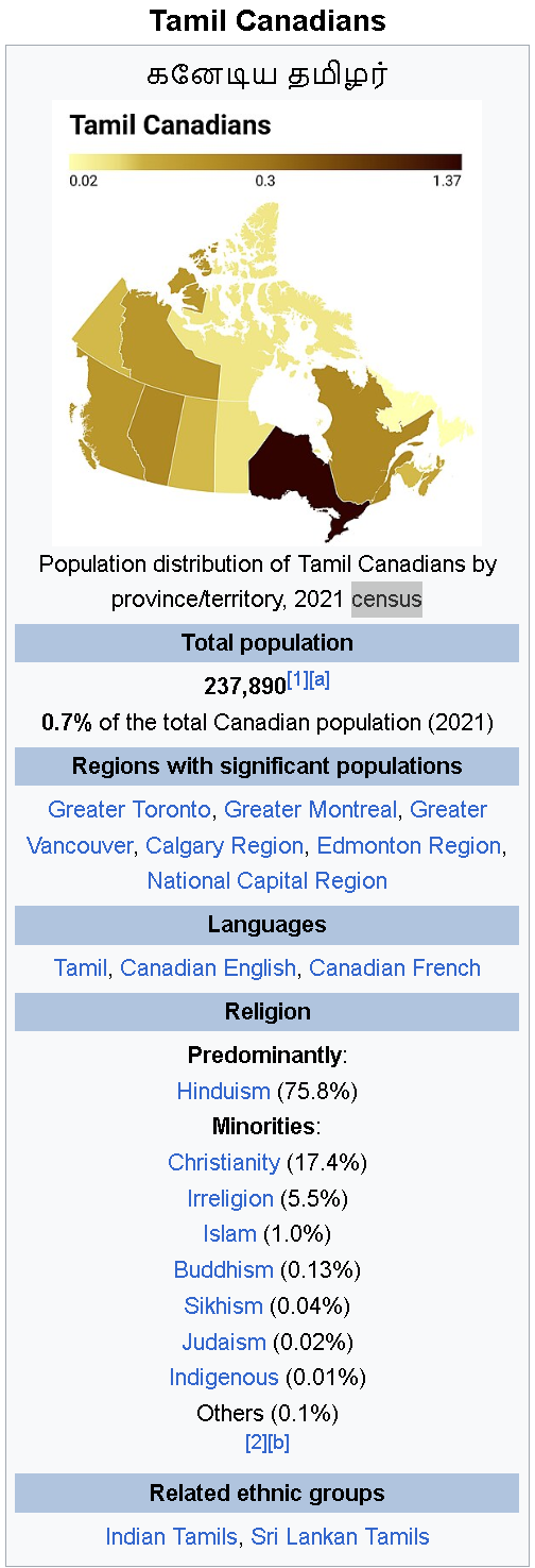 Approximately 240,000 Tamils or 0.07% of Canada’s population (according to the 2021 Census) constitute one of the largest Tamil communities outside Asia, and most of these live in Toronto.